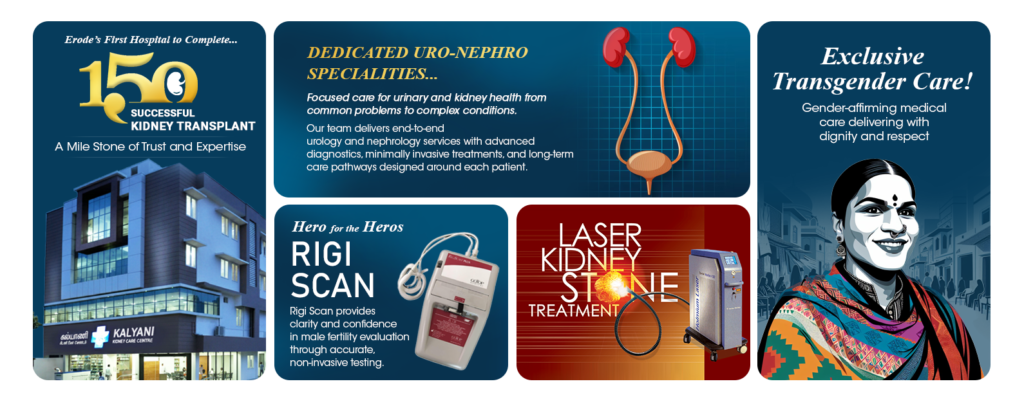 Kalyani Kidney Care Centre is a top-rated kidney hospital in Erode, known for its high success rate in advanced kidney care. With over 150 successful live and cadaver kidney transplants and more than 1,500 laser kidney stone procedures, we provide world-class, patient-centered care. Our dedicated uro-nephro team, led by Dr. M. Prabakar, delivers precise, safe, and compassionate treatments for a range of urinary and kidney conditions. We also offer Rigi Scan for male fertility and exclusive Gender Affirmation Surgery (GAS), ensuring dignity, safety, and full sexual function. At KKCC, advanced technology, clinical excellence, and affordability come together to make us the trusted choice for kidney care in Erode.